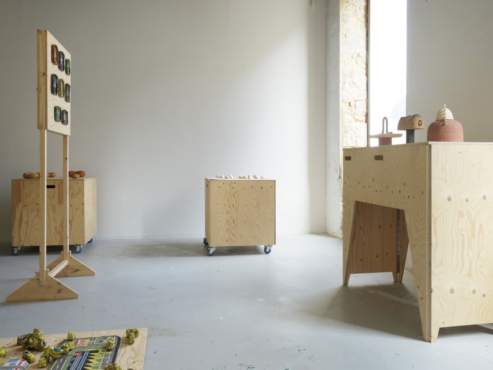 Mon travail consistait à proposer une scénographie d’exposition facile à transporter, à monter et à démonter, et qui puisse s’adapter à des espaces d’exposition divers. Les caisses logistiques nécessaires au transport des œuvres en céramique ont constitué le point de départ de la réflexion. Et si ces caisses pouvaient aussi devenir les socles des œuvres transportées ? Conservant l’aspect brut du contreplaqué, cette scénographie s’appuie sur des structures simples, mobiles et pliables.